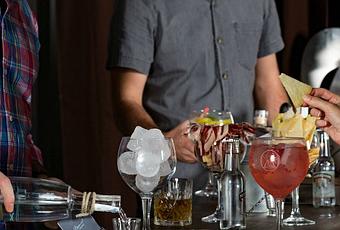 Todo el mobiliario y la decoración han sido elegidos y prácticamente confeccionados por ellos, diseñadores gráficos e interioristas. Es el caso de sus curiosas mesas hechas a medida, con una capacidad de 4 a 6 personas y un espacio ad hoc donde colocar el hielo, las botellas y los refrescos que elijas. Dispones de un vasito medidor y un mezclador para cada consumición, además de una mesa buffet en la que puedes elegir entre todo tipo de especias, cítricos, bótanicos y snacks dulces y salados.