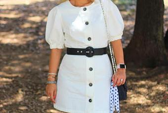 Hoy os enseño un look con una de mis compras de rebajas. Como ya os enseñé en el post de inspiración, una de las tendencias de esta temporada son los vestidos con botones y cuando vi este vestido blanco con botones y mangas abullonadas, me enamoré de él. Lo combiné con un cinturón negro, unas sandalias doradas con volantes y mi nuevo cestito negro.