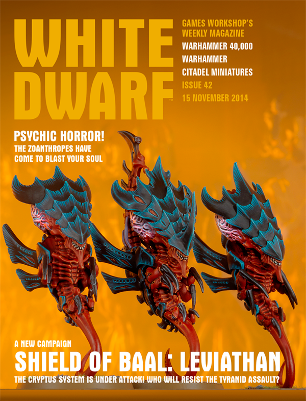 Respecto a la revista, como viene siendo habitual en su portada nos encontramos una tríada de Zoántropos. Las primeras 15 páginas (casi la mitad de la revista) de la revista están dedicadas a las novedades de Games Workshop y de Black Library. Un pequeño artículo sobre la guerra urbana (Citis of Death) y otro sobre enfrentamiento de aeronaves ocupan otras 6 páginas. Como está siendo habitual, se incluyen las reglas de las nuevas miniaturas: Zoántropos y del Neutrothrope. Esta semana la sección de Paint Splatter tenemos un pasoa a paso completo sobre la pintura de la Guardia Tiránida, no sólo de pequeños detalles como vienen siendo habitual. Por lo que veo es parte del nuevo libro de pintura de los Tiránidos que está también en prepedido.