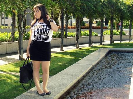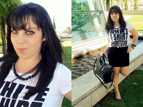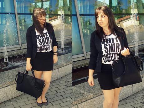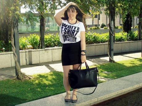 ¡Hola amores! :) El pasado sábado, aprovechando que el sol volvía a dejarse ver por Vigo, y la temperatura era bastante agradable, dedicamos salir a desayunar al puerto y pasear por alguna de nuestras tiendas preferidas.Para esa mañana, aposte por combinar mi nueva camiseta black&white con mensaje, de H&M con falda de tubo y blazer en negro. Dando el toque diferenciador con bailarinas con mini-tachas de XTI Shoes y bolso shopper. Un look cómodo, pero a la vez muy femenino y tan bueno para una mañana de compras como para ir a la oficina.