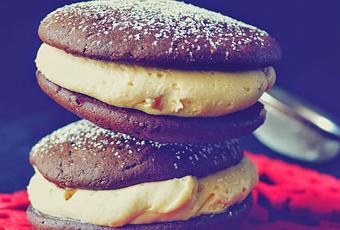 Para este año os traigo unos Whoopie pies de chocolate rellenos de turrón. Para los que no lo sepáis los whoopie pies son como unos bizcochitos pequeños que se hacen sin molde, se juntan dos y se rellenan. Provienen de la tradición Amish de Pensilvania, las mujeres los horneaban y los colocaban en las fiambreras de los agricultores, los hombres al verlos exclamaban :¡Whoppie!, de ahí el nombre.