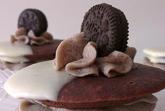 Este whoopie pie consiste en un bizcocho de chocolate, con crema de Oreo y decoración de chocolate blanco y más crema de Oreo!!