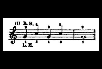 El ejercicio que más utilizo, aparte de las escalas, se basa realmente en un principio que se emplea constantemente al tocar todas las escalas y el piano en general: el de colocar el pulgar encima y debajo de los dedos. ¿Alguna vez te detuviste a pensar con qué frecuencia se emplea esto? Apenas uno da un paso más allá de los primeros niveles del aprendizaje y se topa con esta cuestión. Exige una acción muscular completamente diferente a la de presionar las teclas, ya sea con el dedo, el antebrazo o el brazo.