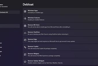 - Eliminar bloatware y aplicaciones preinstaladas, incluyendo Microsoft Edge, OneDrive, Widgets, Copilot y la Microsoft Store.