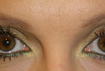 En todo el párpado puse la sombra Adam´s Apple para unificarlo. Después iluminé el lagrimal y apliqué desde este último hasta la mitad del párpado, el tono Fig. En el arco puse la Phyton y la integré bien con la Tree of Life en la uve externa. Debajo de la ceja volví a poner la Adam´s Apple para darle luz.