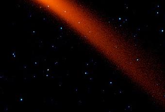 Arriba: Cometa Siding Spring aparece en color rojizo porque es relativamente frío. Su cola se extiende por unos 16 millones de kilómetros. Durante su inspección, se espera que la misión encuentre docena de cometas, incluyendo algunos que pasan muy cerca de la órbita de la Tierra alrededor del Sol. Crédito: NASA/JPL-Caltech/UCLA.