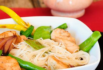 Una pechuga de pollo en dados2 dientes de ajoun puñado de tirabequesun puñado de judías verdes1 cebolleta tierna200 gr. de fideos de arrozuna cucharadita de sal y pimienta molida4 cucharadas de aceite de sésamo4 cucharadas de aceite de cacahuete2 cucharadas de salsa de sojauna cucharada de vino de arrozuna cucharadita de azúcar