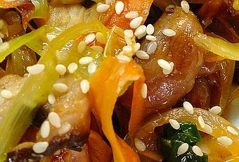 Cortamos la pechuga a tiras y en un bol la maceramos, al menos una hora, con un ajo prensado o picado muy pequeño, un par de cucharadas de aceite de sésamo o de girasol, 3 cucharadas de salsa de soja, pimienta, el vino y un poquito de sal.