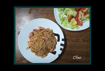-4 salchichas frescas de pollo-12 langostinos pelados-Fideos chinos-Pimientos tricolor-1 cebolla-Salsa de soja-2 dientes de ajo-Especias al gusto-Aceite