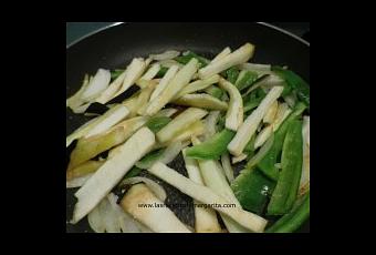 Cortamos la cebolla, el pimiento y la berenjena el tiras