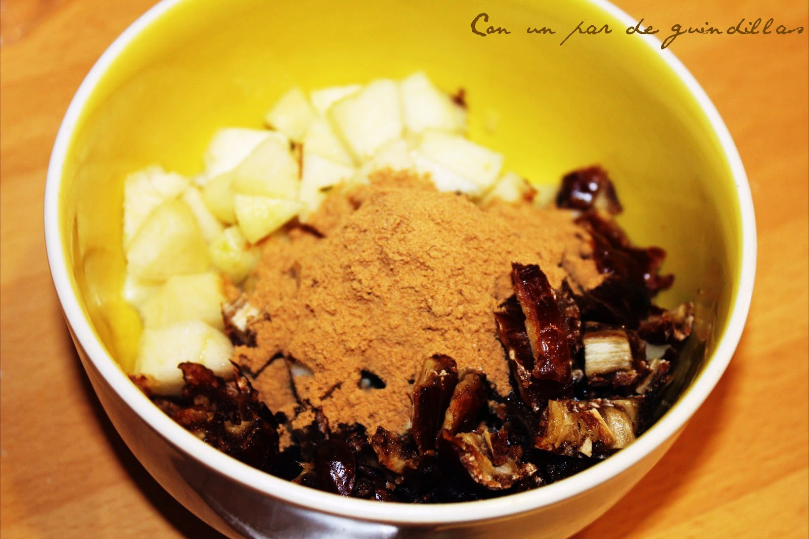 1.- Pelamos y picamos las peras en dados pequeños. Las mezclamos con los dátiles picados, las almendras y la canela.