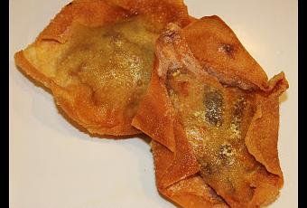 En este caso, si bien se utiliza láminas de won ton, la receta no es originaria de ningún lugar exótico, a no ser que consideremos exótico el muy castizo barrio de Arganzuela, me explico, esta receta no está sacada de ningún libro recopilatorio, ha sido inspiración de nuestra primorosa chef.