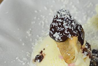 Para preparar el plato, poner en el fondo unas bolas de helado de vainilla, encima colocar 3 empanadillas wonton por persona, regar con la salsa de chocolate reservada (que podemos templar para que esté más buena) y por último adornar con un poco de chocolate blanco rallado.