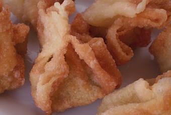 Cuando preparo lomo asado, una parte, bien los “picos” o algún que otro filete lo paso por la picadora.Picar la parte verde de una cebolla dulce (o una cebolleta) en trozos muy pequeños.En una sartén echar dos cucharadas de aceite de sésamo y pochar la cebolleta uno o dos minutos, agregar la carne picada, remover un minuto y reservar.En un bol echar la carne, un huevo batido, una cucharada de salsa de soja, una cucharadita de maicena, una cucharada pequeña de azúcar moreno, una pizca de sal y mezclar bien a fin de que quede una pasta homogénea.Poner las hojas de wonton sobre una superficie plana, en cada una, echar una cucharadita de la masa en el centro, unir mojando en agua con un dedo los bordes y cerrar, dando la forma que gusten.Freir en abundante aceite muy caliente (yo uso freidora).