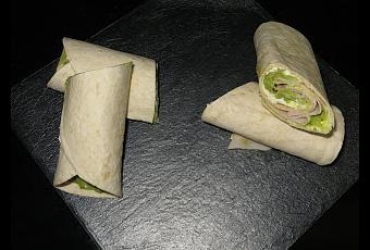 Cogemos la tortilla de trigo y le untamos una capa generosa de queso crema, también puede ser mayonesa, ponemos encima el fiambre de pavo y el aguacate en lonchas. Con un tenedor aplastamos un poco el aguacate para que luego sea más fácil de enrollar. Si queremos darle un toque picante añadimos un jalapeño en trocitos.