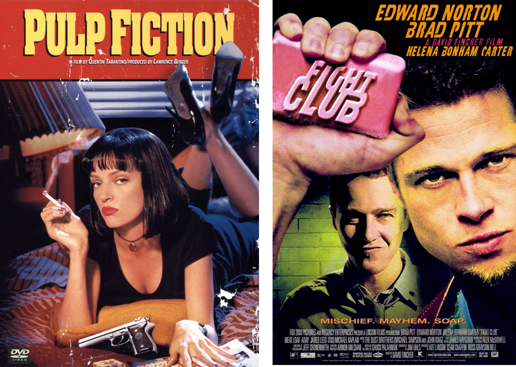 -Pulp Fiction, película de Quentin Tarantino... también considerada película de culto! con esta madrugéviéndola y me gusto bastante! hay escenas bien bizarras y sin duda lo que mas disfrute fue la story-line y la forma en la que esta superpuesta la película y es que no tiene un orden cronológicocomún-The Fight Club, esta película la había querido ver desde hace mucho y cuando por fin lo hice fue JUST WOW! esta muy divertida y el narrador es de lo mas particular! sin duda se las recomiendo... y desde ya es de las películas "mas raras" y por ende de las mejores que he visto en mi vida.