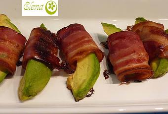 Cortamos el aguacate en lascas de 2 cm de grosor, las envolvemos en las lonchas de beicon. Las colocamos en una bandeja de horno con papel debajo. Metemos en el horno a 200ºC hasta que el beicon se cocine.
