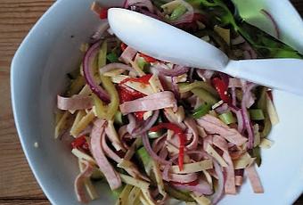 Preparación: Pelar la cebolla y cortar en medias lunas. Cortar el pimiento, los pepinillos, el queso y el embutido en tiras finas. Cortar las cebolletas (incluida la parte verde) en aros. Poner todo en una ensaladera y mezclar bien.