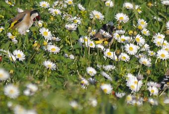 Hace unos días encontré un grupillo de jilgueros en Peroño, a las afueras de Luanco, volando por los prados segados y posándose sobre las margaritas Bellis perennis. Y yo pensé para mí, que pájaros más sibaritas, ahora comen flores...