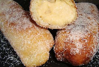 Poner la crema en una manga pastelera y poner un cordon de crema en el centro de cada trozo, cerrar el bollo y asegurarse que los lados estan sellados para que no se escape la crema cuando se frian.