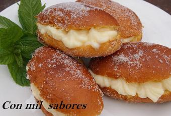 Ponemos el aceite a calentar y cuando esté en su punto freímos las medias noches , dándoles la vuelta muy rápido pues se queman con facilidad . las sacamos y las pasamos por azúcar y canela(emborrizamos), las cortamos por la mitad y las rellenamos con la crema que habremos metido previamente en una manga pastelera.