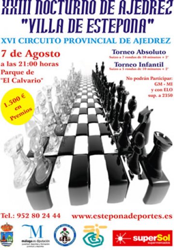 Este sábado 7 de agosto XXIII Nocturno de Ajedrez "Villa de Estepona", a las 21:00 horas, en el Parque El Calvario.El XXIII Torneo Nocturno de Ajedrez de Partidas Rápidas "Villa de Estepona" está incluido dentro del XVI Circuito Provincial de Ajedrez, organizado tanto por el Área de Deportes de la Diputación Provincial de Málaga como por la Delegación Malagueña de Ajedrez, además de los ayuntamientos participantes. Se celebrará en el Parque del Calvario a partir de las 21:00 horas del sábado 7 de agosto hasta las 02:00 horas, aproximadamente.