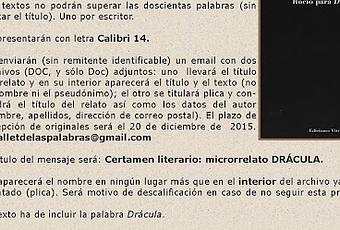 Se convoca el XXIV Certamen de microrrelatos de El Ballet de las Palabras. Esta vez, la palabra a incluir es Drácula. Se recuerda que se aceptarán solamente archivos doc. No podrá aparecer el nombre del autor más allá del documento que incluya la plica. De manera que no aparecerá ni en la dirección de correo ni en el avatar. Si te gusta la entrada, suscríbete a El ballet de las palabras: el blog cultural. by Email