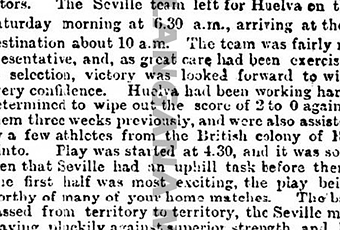 El partido de vuelta entre los recientemente constituidos clubes anglo-andaluces, Huelva y Sevilla, tuvo lugar en el campo del primero el Sábado, 29 de Marzo, ante la presencia de 400 a 500 espectadores. El equipo de Sevilla salió para Huelva el sábado por la mañana, a las 6:30, llegando a su destino sobre las 10:00 de la mañana. El equipo era bastante representativo y, como se había tenido mucho cuidado en su selección, se esperaba la victoria con gran confianza. Huelva había trabajado duro, decididos a acabar con el tanteo de dos a cero en contra de tres semanas atrás, y se reforzaron con varios atletas de la colonia británica de Rio Tinto. El juego comenzó a las 4:30 y se vio muy pronto que Sevilla tenía una ardua tarea ante sí. El primer tiempo fue más emocionante, el juego era digno de muchos de vuestros partidos de casa. La pelota pasaba de un territorio al otro, los hombres de Sevilla se batieron valientemente contra una fuerza superior y, por la belleza de las combinaciones y pases de los delanteros, después de veinticinco minutos de juego, Pollock anotó el primer tanto, terminando los primeros cuarenta a favor de Sevilla por 1 a 0. Tras la reanudación, Huelva parecía más decidida y salió con un guión. Sevilla se defendió bravamente, siendo especialmente llamativo el juego en la portería de Lindberg. Pero a nadie extrañaba que estaban fatigados, debido sin duda a su largo viaje de la mañana y adicionalmente, a que tres de sus hombres habían estado jugando dos horas al tenis. Huelva, no se puede negar, y por su trabajo duro, terminó el partido ganando por 2 goles a 1. (7 de Abril de 1890, página 4, "The Dundee Courier")