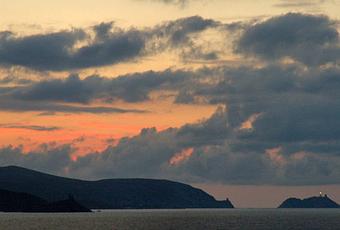 Capicorsu, el punto más septentrional de la isla, al anochecer, desde el mar.