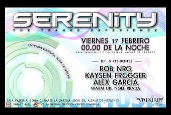 En ya menos de 24 horas, tendrá lugar el inicio de un fin de semana que promete ser muuuuy largo para tod@s l@s amantes trance de Madrid. Y es que antes de la entrance 06 de este sábado en la sala Starving, concretamente hoy viernes, tendrá lugar Serenity, the trance experience, al norte de la capital. Desde las 00:00h de la noche, a cierre, contaremos con la presencia de Rob NRG, Kaysen Frogger, Alex García y Noel Prada. Este último será el encargado del warm up progressive house que abrirá el evento. A partir de aquí se inicia un viaje que pasará por todas las vertientes trance, tanto actuales como clásicas. Viaje que liderarán de forma alterna Rob, Kaysen y Alex. Esta es la razón por la que no se ha acotado el tiempo de cada uno de los protagonistas. Todo un b2b de múltiples combinaciones. Serenity, que busca establecerse como sesión trance mensual, sonará en la sala Valkiria (Centro Comercial La Garena) de Alcalá de Henares.