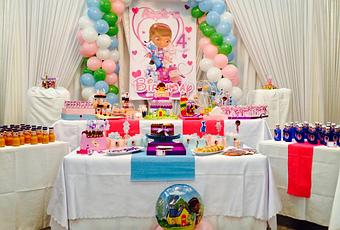 Un gran retrato del rey preside la sala. Entramos. En el interior ya hay gente. Esto es la bomba. La sala es enorme. Está toda decorada. Mesas redondas para los mayores. Una gran mesa central repleta de dulces, golosinas, el pastel, regalos y no sé cuantas cosas más. Más mesas, éstas para los críos. Hasta hay castillos inflables. No uno, ni dos, ni tres. Sino cuatro.