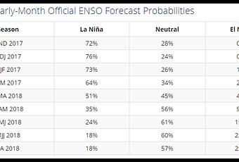 El fenómeno La Niña se ha consolidado con una débil intensidad, tal y como indicaban en consenso los modelos meteorológicos y diferentes análisis que se ejecutaron. Debemos recordar que esto ocurre cuando la mayor parte del Océano Pacífico Central y Oriental a nivel ecuatorial registran temperaturas anómalas negativas, es decir, valores por debajo del promedio (-0,5ºC o por debajo de éste valor durante tres meses consecutivos). En tal sentido se ha emitido una Advertencia de La Niña. De acuerdo a las predicciones, el nuevo evento de ésta variable climática (el último ocurrió a finales de 2016 hasta febrero de 2017) persistiría hasta febrero-abril de 2018: