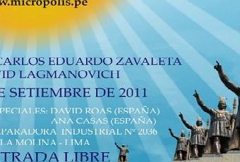 Via el Blog del eventoEl Grupo Literario Micrópolis tiene el gusto de invitar a todos los simpatizantes del arte de la minificción a la primera jornada peruana de este género, la cual se desarrollará los días miércoles 14 y jueves 15 de septiembre del presente año.El evento se realizará en la Av. Separadora Industrial Nº 2036, La Molina – Lima (Perú) entre las 14:00 y las 22:00 horas en homenaje a Carlos Eduardo Zavaleta y a David Lagmanovich. Se contará con la presencia de David Roas y Ana Casas (España).PROGRAMA DE LA PRIMERA JORNADA PERUANA DE MINIFICCIÓNMIÉRCOLES 14 DE SETIEMBRE15:00 horas: Inauguración de la Primera Jornada Peruana de Minificción a cargo de Alberto Benza González y Rony Vásquez Guevara.