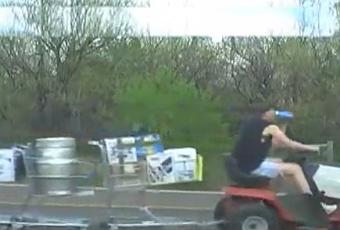 Genial el video de este amigo norteamericano que pasa por delante de una patrulla de policía, montado en su cortacésped y bebiendo una gran lata de cerveza, mientras tira de un convoy de 10 carritos de la compra cargados de cerveza en todas sus variedades, botellas, latas y barriles. Luego el poli se pasa un poco y le acaba deteniendo con muy malos modos. Pero la situación es de lo más surrealista: