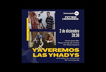 Doble concierto en Fotomatón Bar con sabor a fiesta de sábado, dos buenos directos de proyectos emergentes. Es el momento de poder ver a Yaveremos y Las Yhadys en directo, presentando canciones desde el gran escenario del Fotomatón Bar.Serán dos conciertos en horario de noche los que podamos vivir en el Fotomatón Bar este 2/12, por un lado Yaveremos, una propuesta que nos mostrará lo ya publicado y lo no publicado pero que está por llegar, nos referimos un sonido con apuesta que llega con pop, pero que está con matices como son guitarras distorsionadas, sintetizadores y un crecimiento exponencial. Nacido en Granada con Mariano (Apartamentos Acapulco), Adriana, y más tarde con Gustavo (Colegas y Tal) y María (Las Dianas). Por otro lado, encontramos a Las Yhadys, un proyecto musical que surge a finales del 2020 en Santander y que ha ido creando canciones y exponiendo sus mejores intereses.