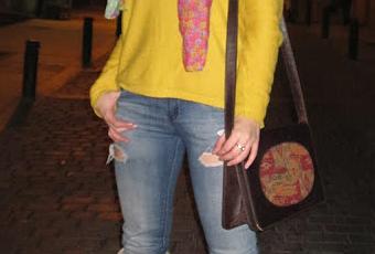 Opte por este bolso, con estilo retro, Su tono marrón conjuga con las botas y el color mostaza del jersey. Para darle un poco de contraste elegí este pañuelo con motivos florares y muchos colores.