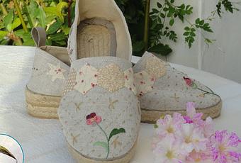Hace un mes una amiga y yo nos compramos unas suelas de esparto, la aguja curva y el hilo para convertirlas en zapatillas (te lo conté aquí). En este mes he pensando mucho cómo hacerlas, y he barajado diversas posibilidades hasta decidirme por unas zapatillas en lino color natural que combina hexágonos en colores similares y bordados en los mismos tonos pero diferentes en cada zapatilla. En los laterales he bordado versos de Juan Ramón Jiménez y Antonio Machado y he aplicado estrellas y mariposas. ¿Todo eso? Pues sí, ya verás lo que han dado de sí estas zapatillas.
