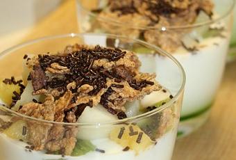 1. Rellenamos tres vasitos con Yogur natural y añadimos la fruta troceada al gusto.