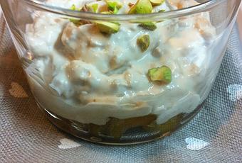 Se bate en un bol el yogur junto al foie, desmenuzando con un tenedor y mezclando bien. Debe quedar una textura cremosa. Se dispone en vasitos de txiquito, o en vasos pequeños de vino, colocando en el fondo la base de manzana caramelizada, encima la crema de foie y yogur y se espolvorean unos pistachos picados muy finos.