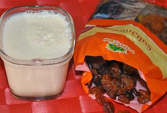 Poner en el fondo de los tarros las pasas y verter con cuidado la mezcla anterior(aunque estas flotan y se quedan en la superficie).