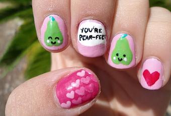 Se trata de un diseño con base rosa y dibujos a mano alzada. Son dos peras (pear en inglés) y una le dice a la otra, haciendo un juego de palabras: "You're pear-fect", (en lugar de perfect)Como veis, aunque no tenga mucha complicación la manicura, queda muy bonita. Y si encima le añades el juego de palabras ya... :P