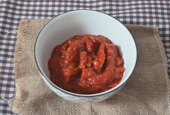 Ingredientes- 1 berenjena.- 1 pimiento rojo.- Aceite de oliva virgen extra.- Tomate frito casero.- Sal.- Pimienta.- 1 hoja de laurel.