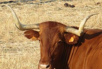 A la derecha retintas, esas raza de vacas rojas, de amplia cornamenta, que dicen que ya aparecían en los jeroglíficos de los antiguos egipcios. No sé si casualidad o normalidad, uno de los días que hice esta ruta, en una de las fincas ¡¡Las vacas estaban sueltas por el camino!! y claro, yendo de rojo como era el caso, daba cierto respeto pasar corriendo a su lado, pero el incidente no llegó a más, aminoré el ritmo y pasé en cierto estado de “prevengan” aunque creo que a las vacas no le interesaba lo mas mínimo mi presencia, seguían a lo suyo.