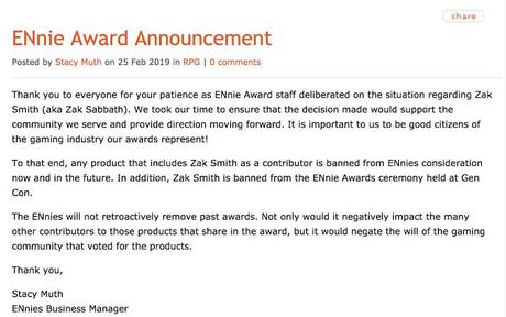 Para los que no estéis muy duchos en inglés, viene a decir que, tras una larga deliberación han decidido que cualquier producto que incluya a Zak "Sabbath" Smith como contribuyente ahora y en el futuro no será considerado elegible como candidato a los premios ENnie, y sera por lo tanto prohibido en el evento. Además, Zak Smith tiene prohibida la presencia en la ceremonia de los premios ENnie durante la Gen Con.