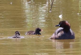 Los polluelos del Zampullín común nacen con un plumón distintivo de rayas blancas y negras. Esta coloración rayada ayuda a camuflarse entre la vegetación acuática, brindándoles protección contra los depredadores. A juzgar por su tamaño y el desarrollo visible del plumón, estos polluelos parecen tener aproximadamente entre 1 y 2 semanas de edad. A esta temprana edad, los polluelos ya son capaces de nadar y bucear bajo la vigilancia de sus progenitores.