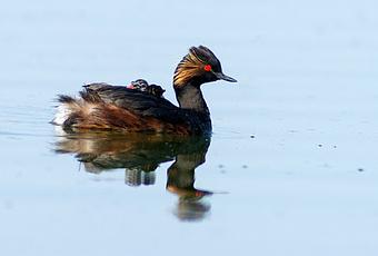 El zampullin cuellinegro ( Podiceps nigricollis) es la pequeña y elegante silueta de cuello largo, erguido con un impresionante ojo rojo, que nada en el Parque Nacional de las Tablas de Daimiel con sus crías encima.