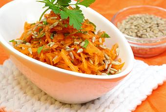 - Cut thin leaves of cilantro or parsley and add to the carrots. Serve in bowls and sprinkle with sunflower seeds.