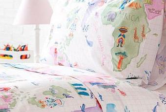 - Sábana encimera con estampado ‘mapamundi’ de esos dibujos que los niños siempre recordarán. La puedes combinar con una sábana bajera en color rosa, verde o azul. La tienes para camas de 90 por 160 y también para cunas de 100 x 150. El precio orientativo a fecha de publicación del artículo es de 9,99 €