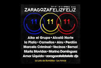 Este año el festival ZaragozaFelizFeliz llega a doble jornada con un gran cartel lleno de nombres de la escena musical. El ZaragozaFelizFeliz sigue siendo un festival de lo más interesante, en esta edición el cartel (a doble jornada) vuelve a reunir lo mejor de la escena para volver a las salas con directos de esos que se recordarán.Este año entre el 20/12 y 21/12 se podrá vivir en Zaragoza una nueva edición de un festival de sala de lo más interesante. El concepto del ZaragozaFelizFeliz es un concepto interesante, el poder llevar a las salas a como son La Lata de Bombillas y Las Armas los directos de proyectos como Aiko el Grupo, Vecinos, Alcalá Norte o de Marta Movidas es una de esas experiencias donde se pone en valor la alta calidad de los directos, sin olvidar los directos de La Plata, Camellos, Airu, Perdón, Marcelo Criminal, Amor Líquido, Bernal o de Marina Domínguez que completan el cartel junto a los djs del colectivo organizador. Una gran experiencia donde se mezclan muchos grandes grupos para la ocasión.