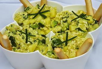 1- Calentar un poco de aceite en la cubeta en menú freír. Ir cortando la patata y calabacín en dados, un poco más grandes que para la ensaladilla.